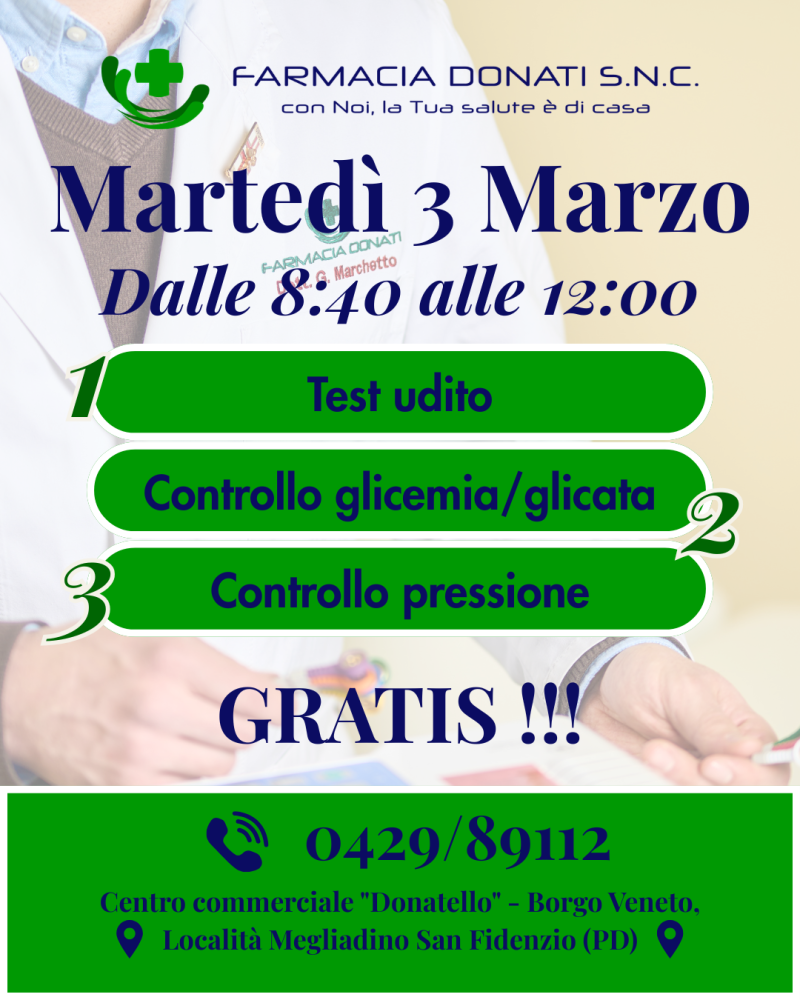 Martedì 3 marzo, dalle 8.40 alle 12.00, la Farmacia Donati dedica una mattinata alla salute con servizi completamente gratuiti: