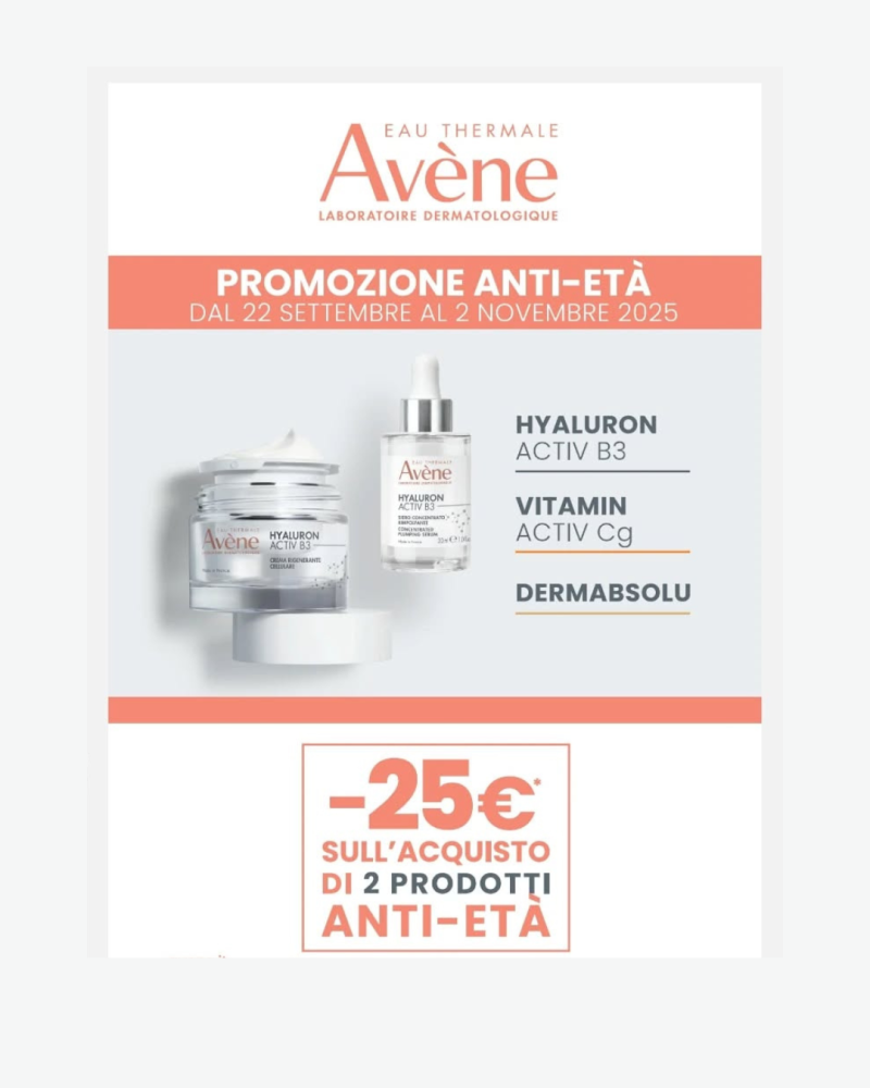 Acquistando 2 prodotti anti-età Avène riceverai uno SCONTO IMMEDIATO di €25.