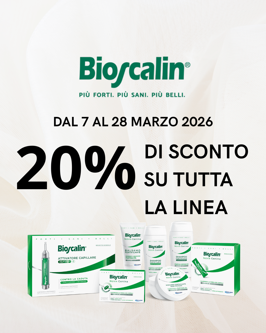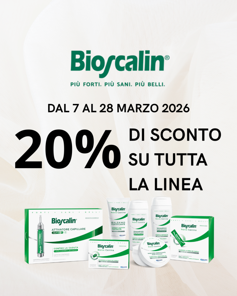Da sabato 7 marzo a sabato 28 marzo alla Farmacia Donati approfitta di uno sconto del 20% su tutta la linea Bioscalin!