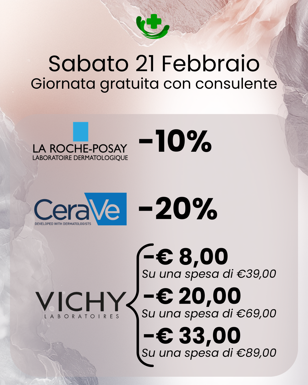 Durante la giornata sarà presente la CONSULENTE specializzata per offrirti consigli personalizzati e aiutarti a scegliere i prodotti più adatti alla tua pelle.