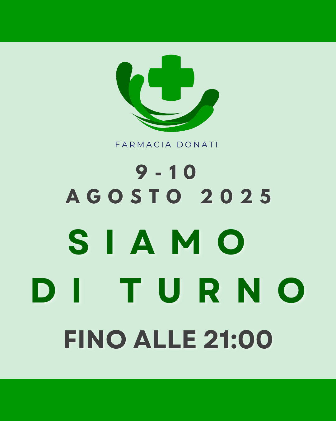 SABATO 9 E DOMENICA 10 AGOSTO Farmacia Donati è di TURNO fino alle ore 21:00.